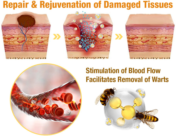 Another significant advantage of bee venom is its ability to enhance blood circulation. It can stimulates blood flow in the treated area, facilitating the removal of skin tags or warts by promoting tissue regeneration and accelerating the healing process, aiding in the repair and rejuvenation of damaged tissues.
