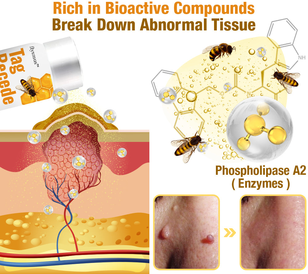 Bee venom contains several bioactive compounds, including melittin, apamin, and adolapin which has been scientifically proven to tackle skin tags or warts effectively. Among its arsenal of enzymes, phospholipase A2 stands out for its ability to break down abnormal tissue, simplifying the removal process of skin tags or warts.